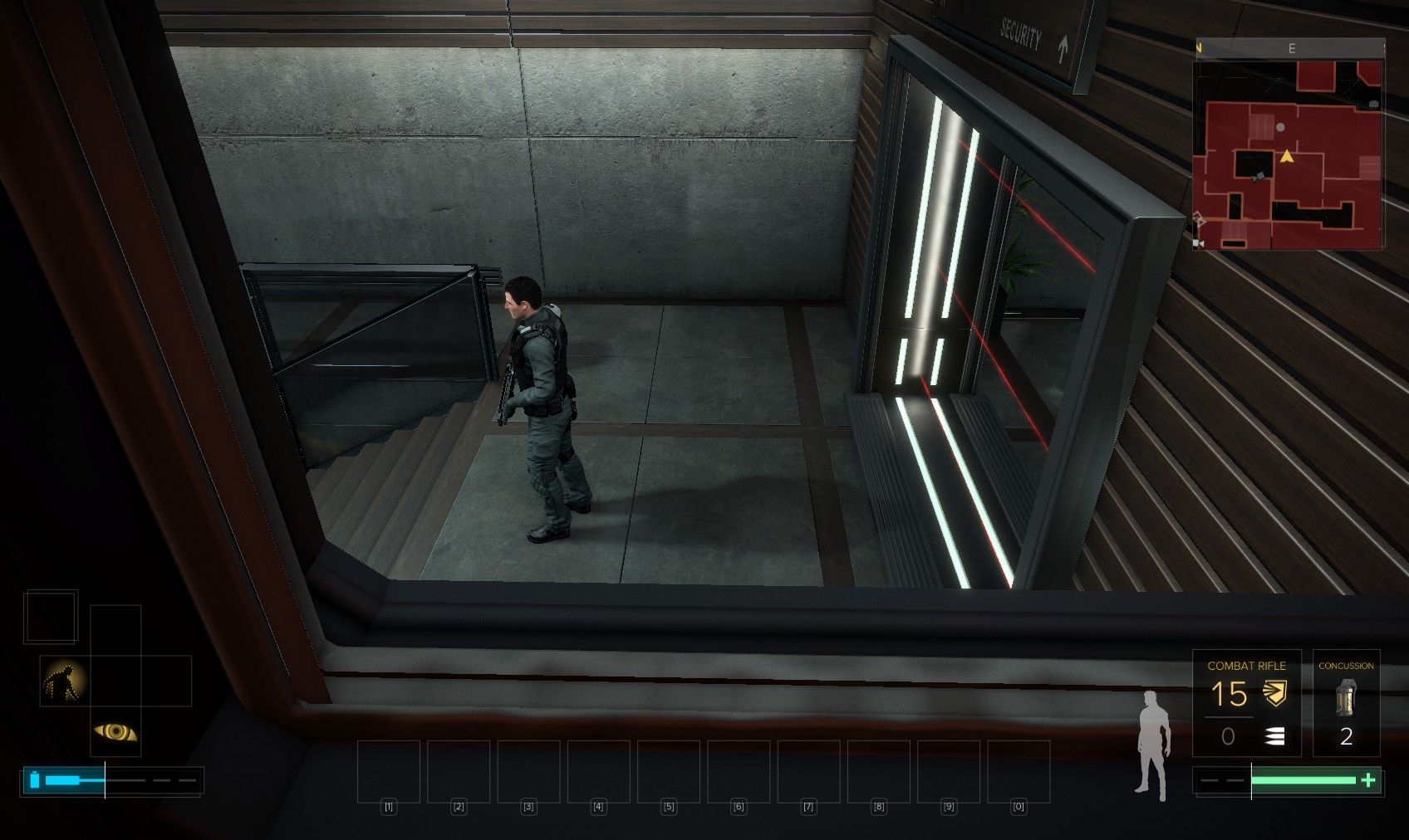 35. This is much more like it! Hack the level 3 security console for 300XP and disable the cameras. You can open the secure door into the command centre if you like, but we’re not going to need it. Nearby is a weapons cabinet with a tranquiliser rifle, and laser sight. Don’t miss the stealth software on a bookcase.