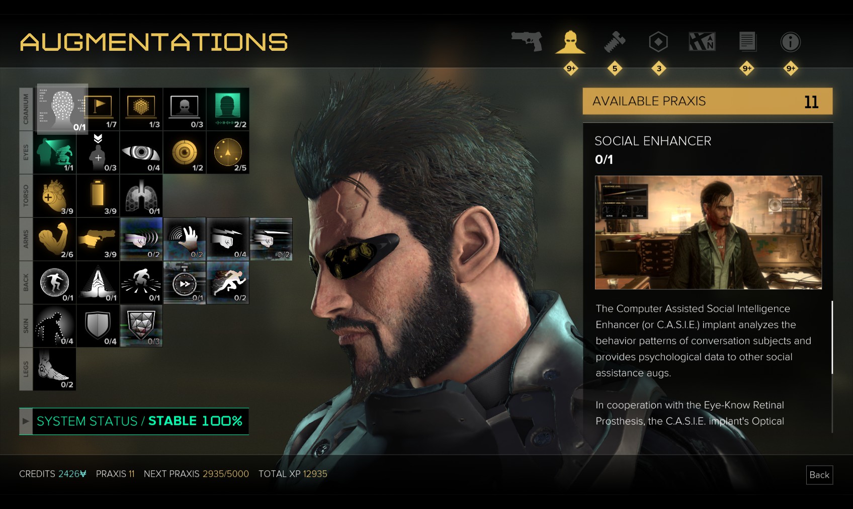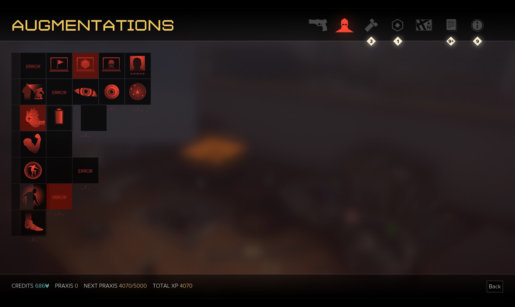 40. After all the kerfuffle, your augmentations have been reset - but you still have the Praxis points so you can choose whatever you like. I upgrade my hacking skills to level 3, and buy hacking stealth but save most of the Praxis points to add augmentations as I need them.