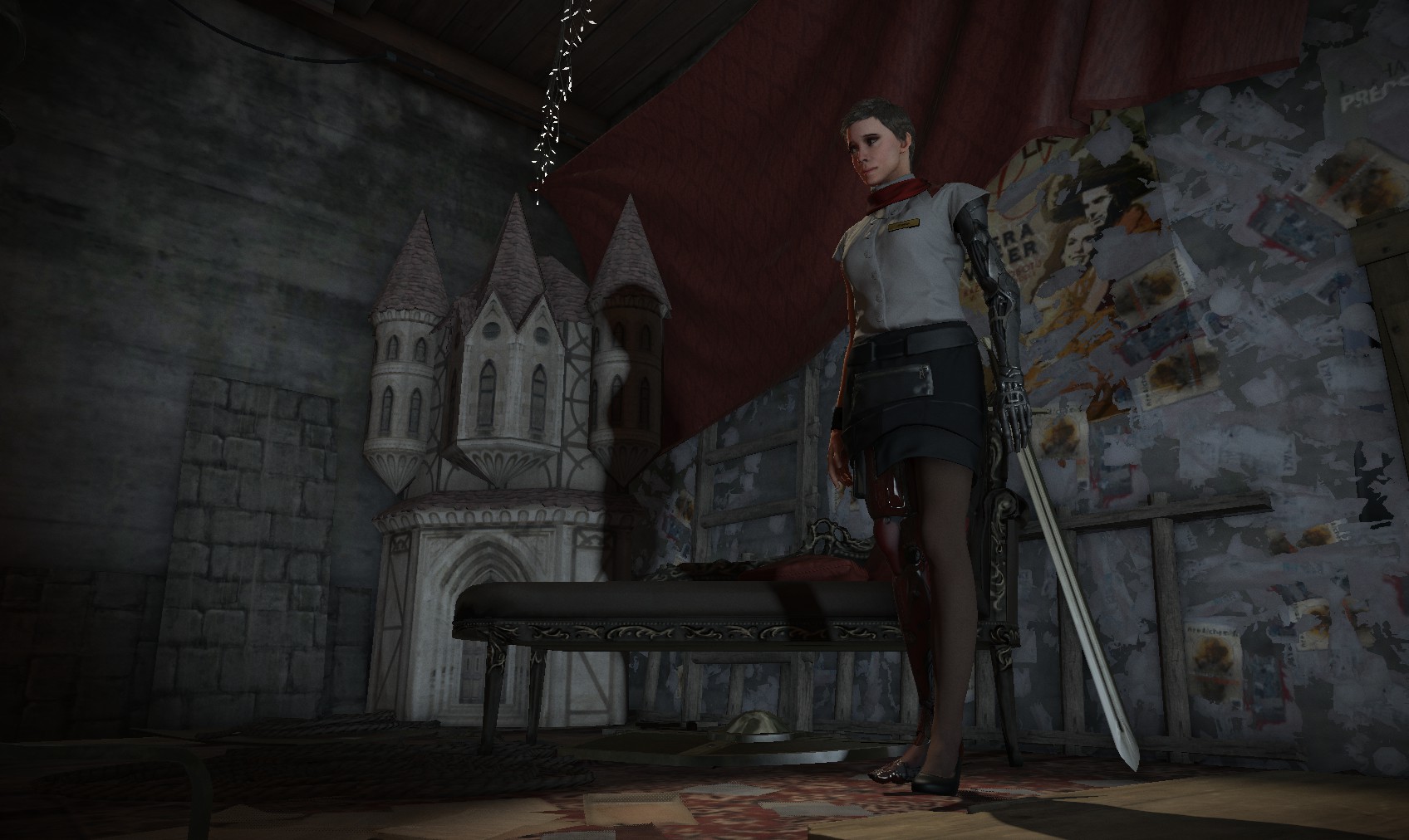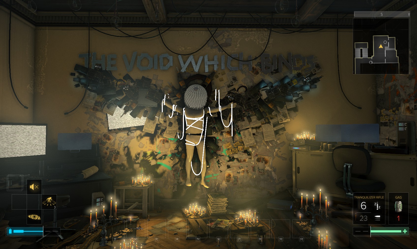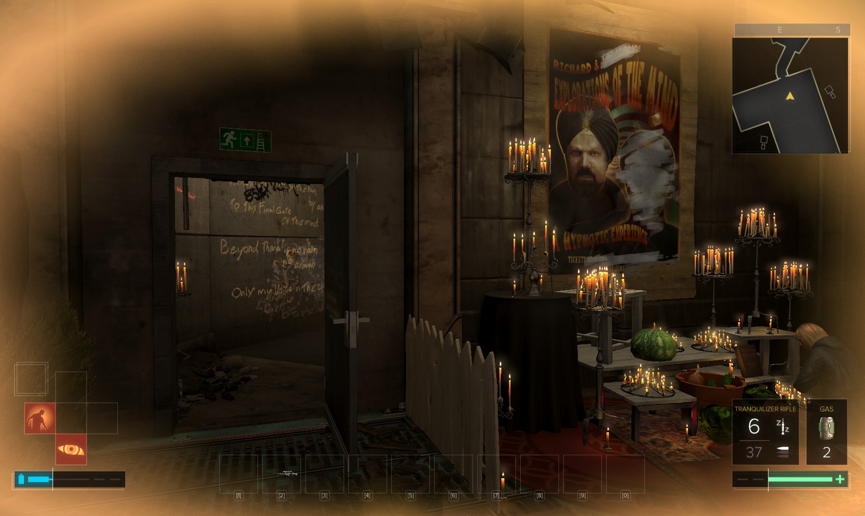 120. And near the exit, a poster of Richard and … someone … has been defaced. Liborio? Your mission must be to find him. Time to leave. As soon as you do, the haze clears and your facilities return.