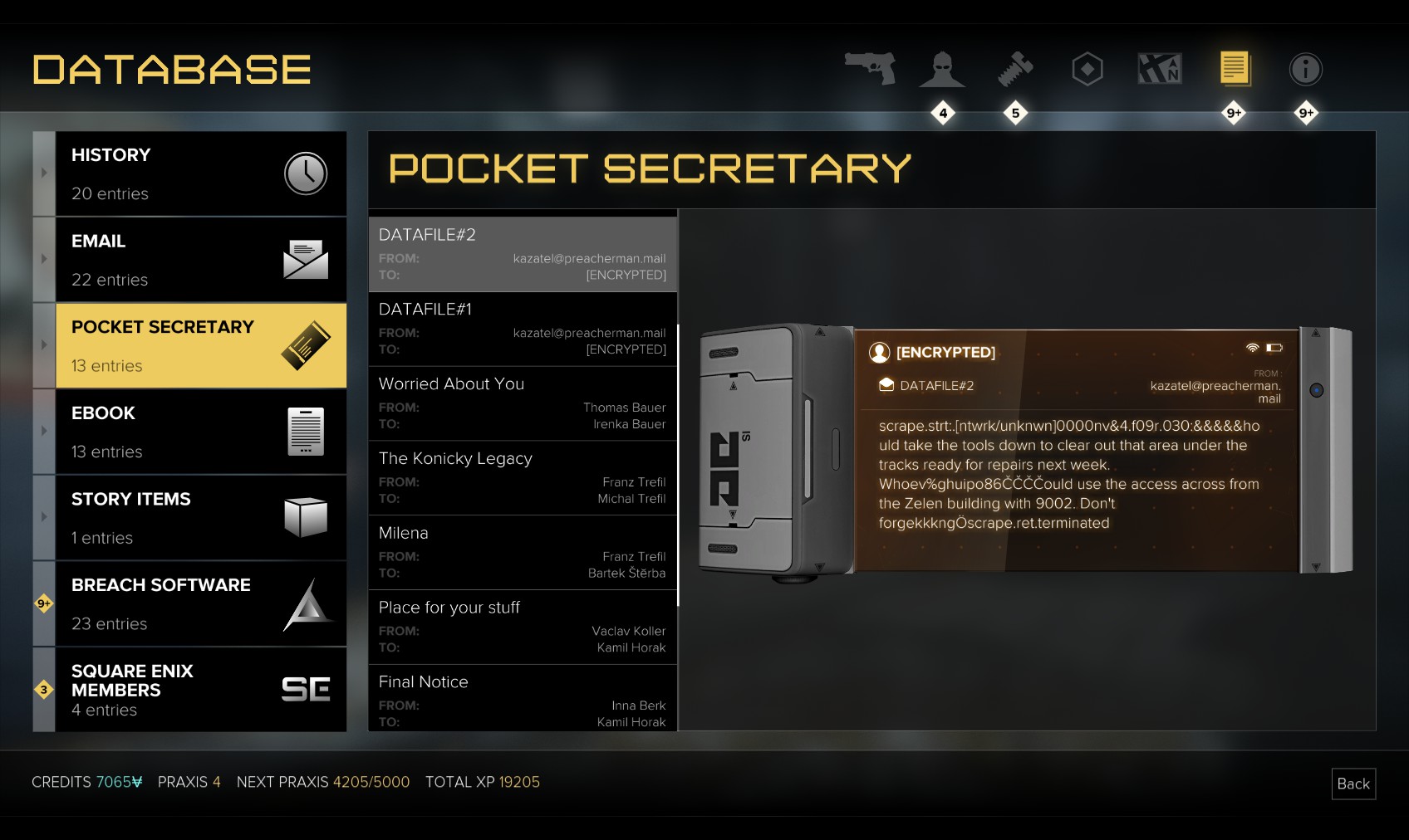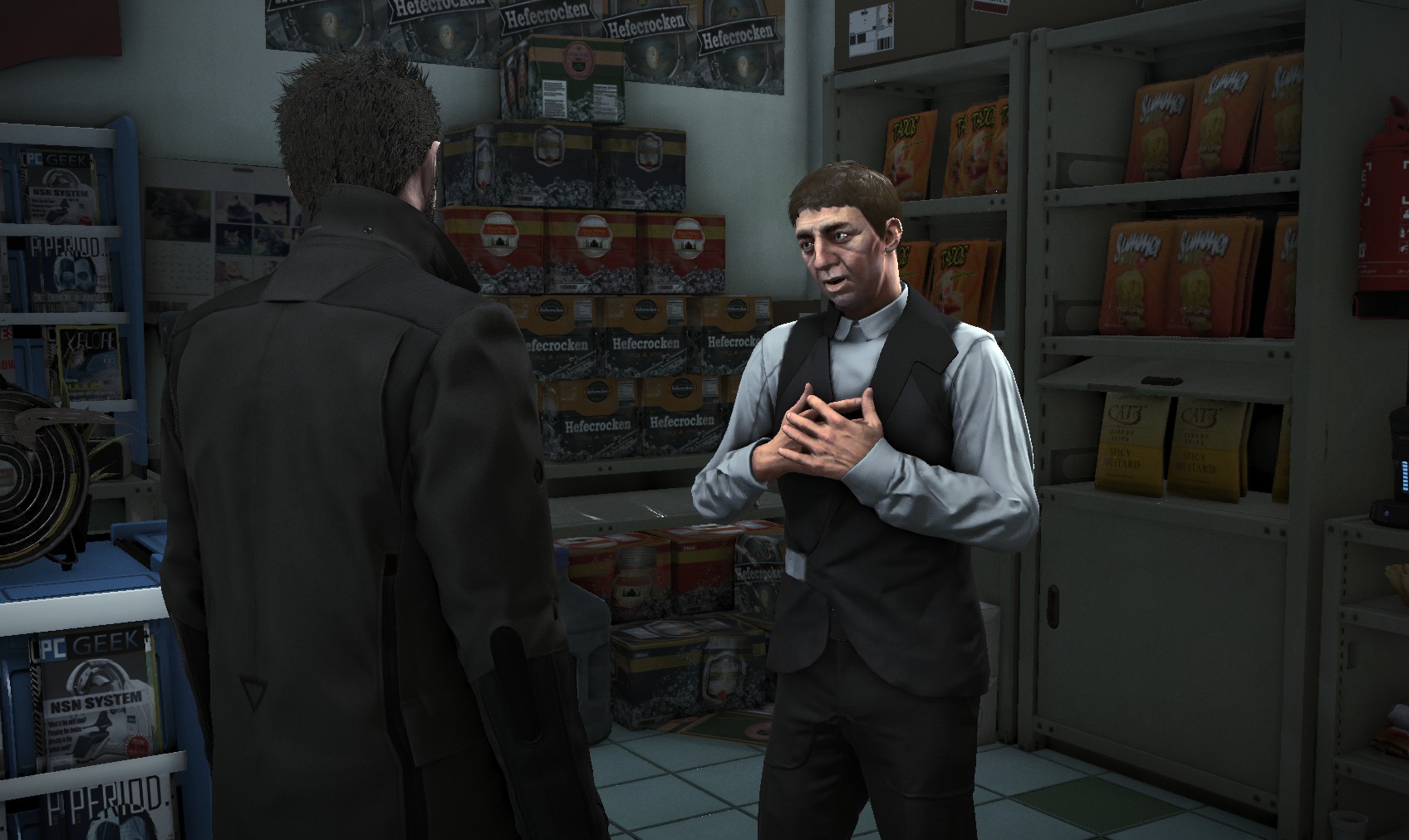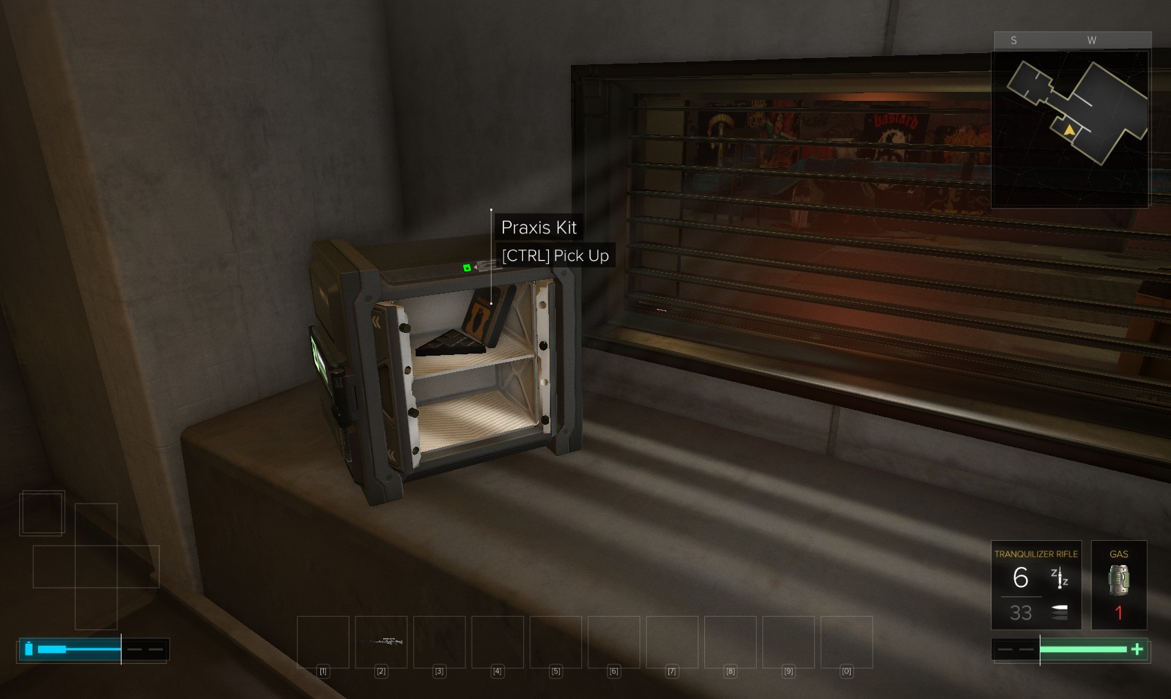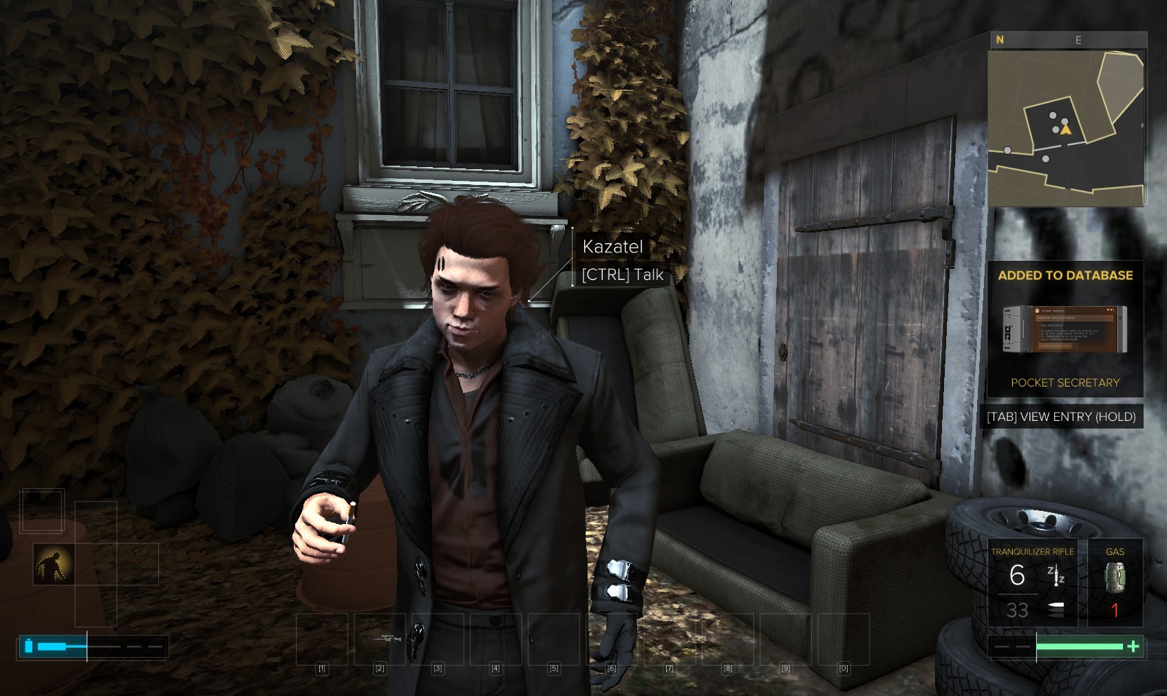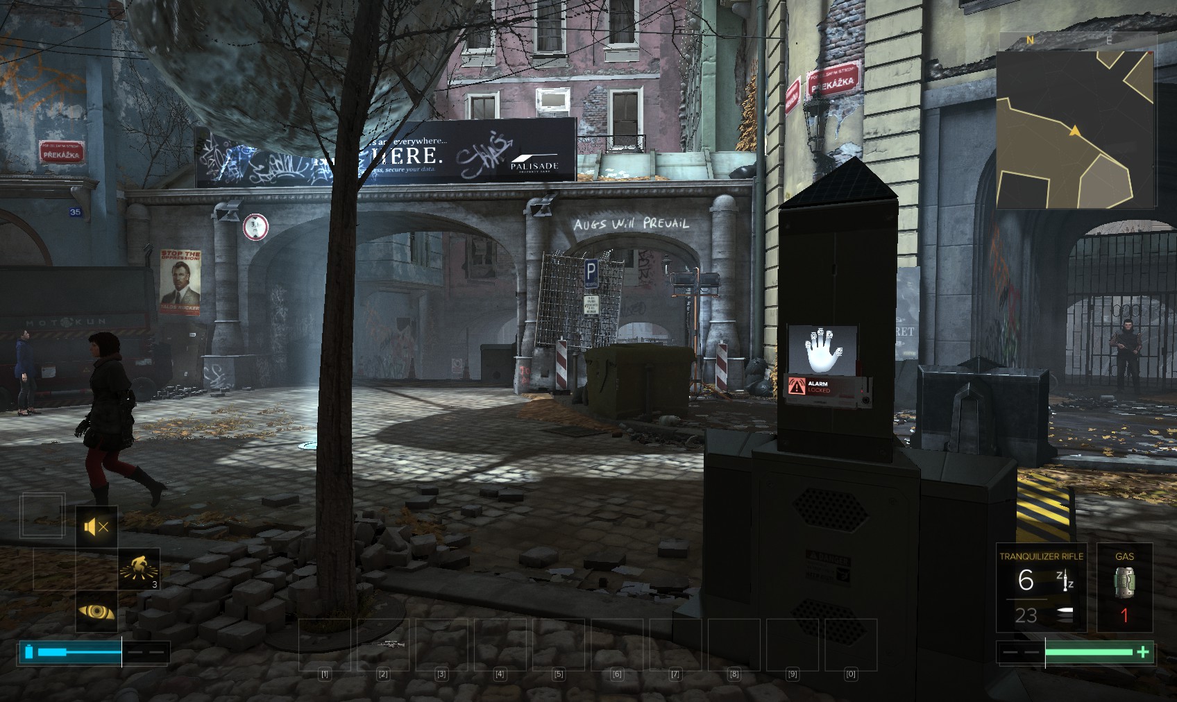 Go upstairs and visit Tars if you want to sell anything off to make space, and then go to apartment 32. The door is unlocked, and a very unhappy - and uncommunicative - gentleman (Olivier Berthelot) is inside. Add insult to injury by raiding his stuff and hacking the level 4 PC for 150XP (just background emails here). What you’re really after is the stash under the window, in particular the Praxis kit. Maybe they’re not his, and he never knew it was there…