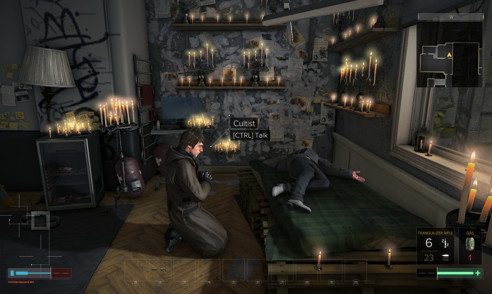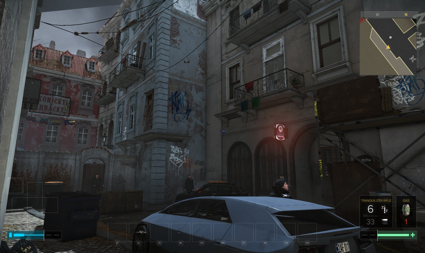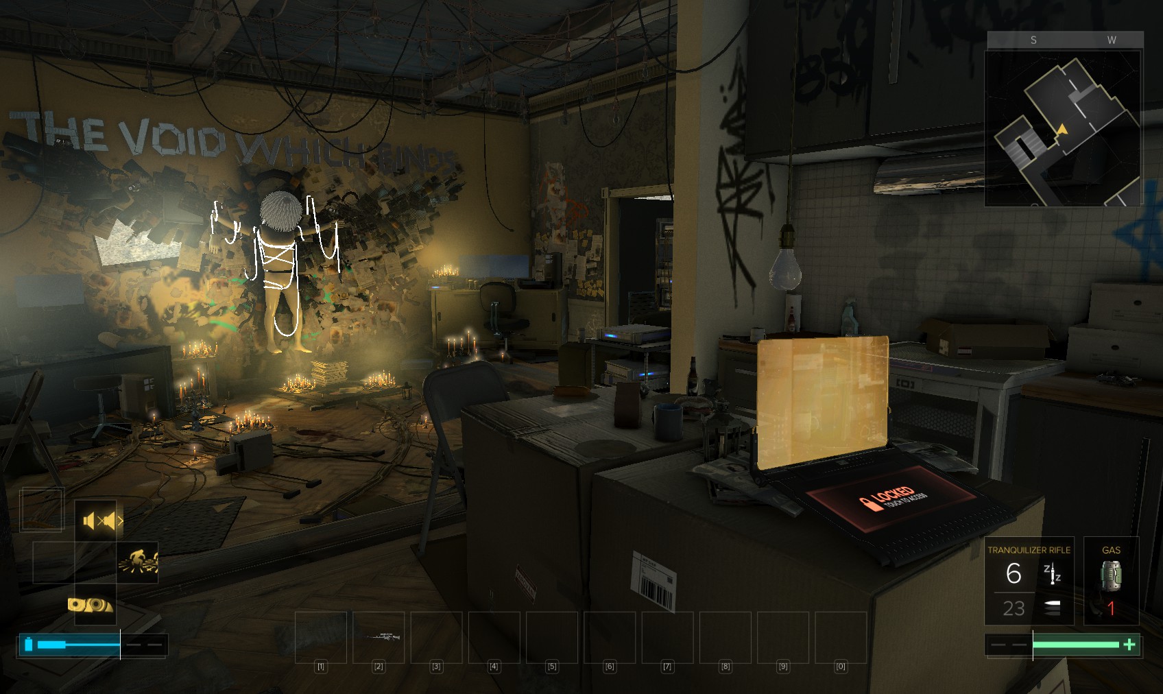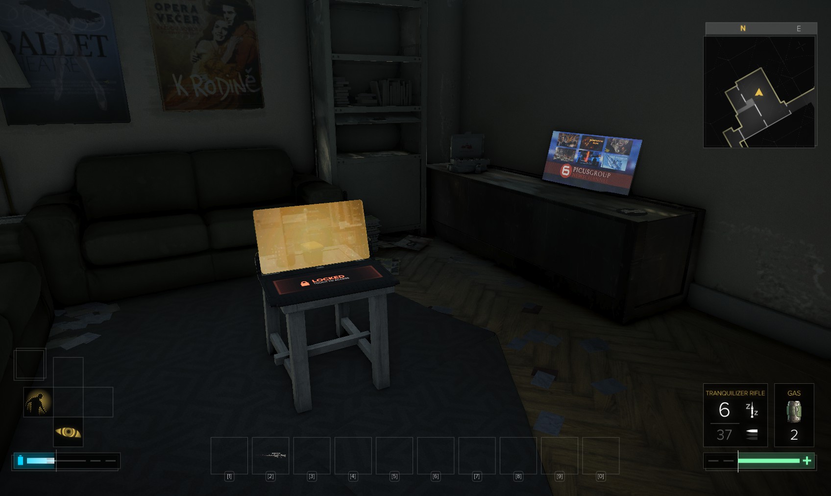 Go upstairs and visit Tars if you want to sell anything off to make space, and then go to apartment 32. The door is unlocked, and a very unhappy - and uncommunicative - gentleman (Olivier Berthelot) is inside. Add insult to injury by raiding his stuff and hacking the level 4 PC for 150XP (just background emails here). What you’re really after is the stash under the window, in particular the Praxis kit. Maybe they’re not his, and he never knew it was there…