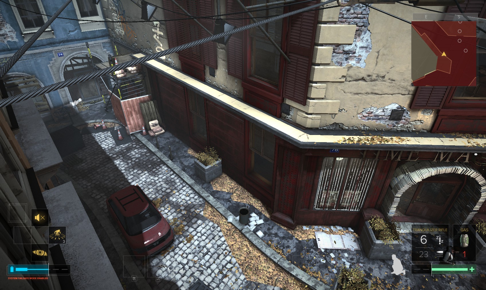 68. You have choices here. Going over the roof requires you to be able to open the shutters (top-right), which means purchasing the experimental "remote hacking" augmentation. Going the direct route through the house is a maze of cameras and lasers, but is quite fun.