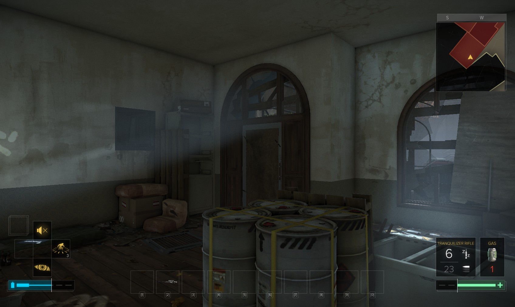 88. You’re heading for the safe next to the wall at the back - which is open and contains credits, a gas grenade, some more Neuropozyne and a pocket secretary. Snaffle everything then leg it over the hut next to it.