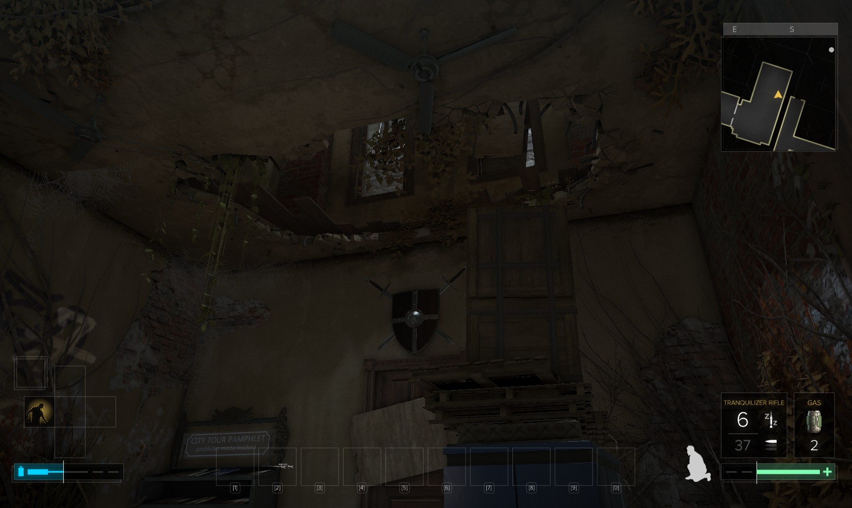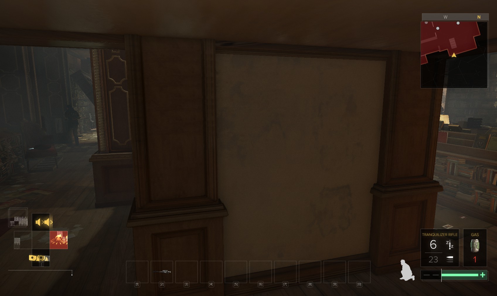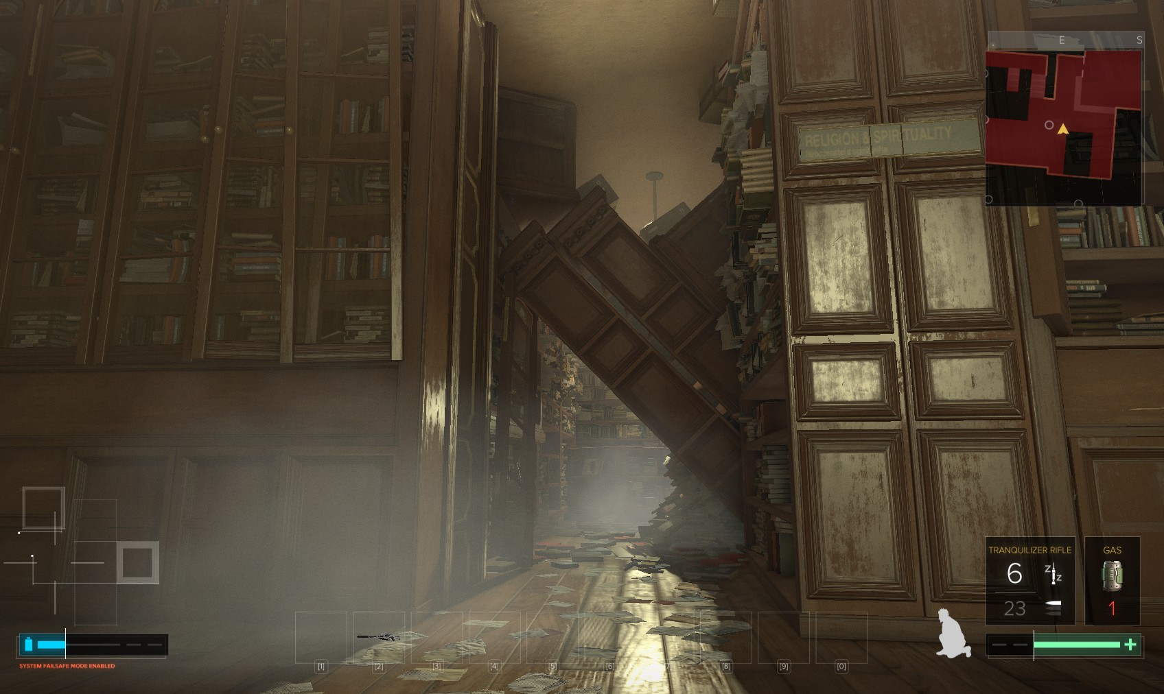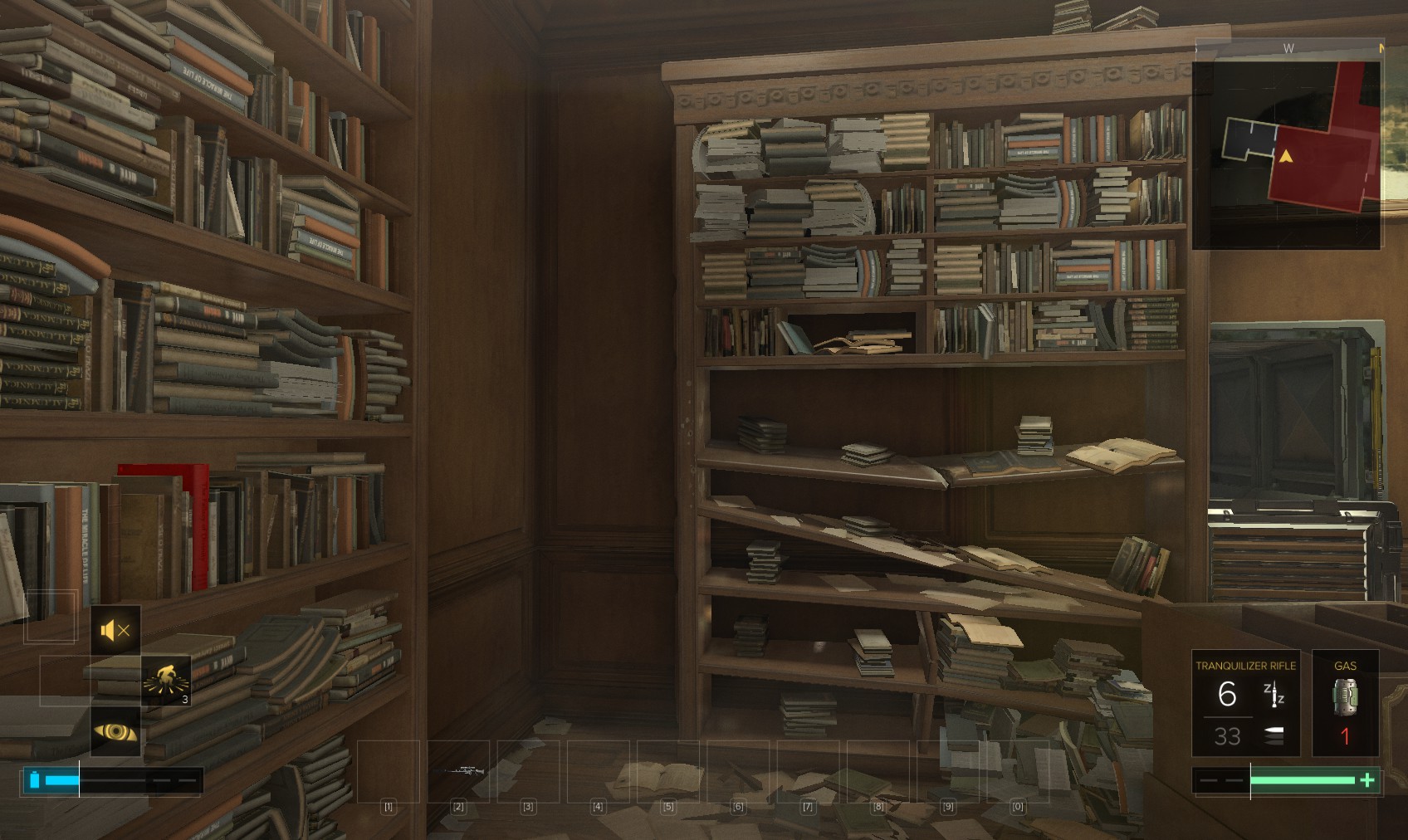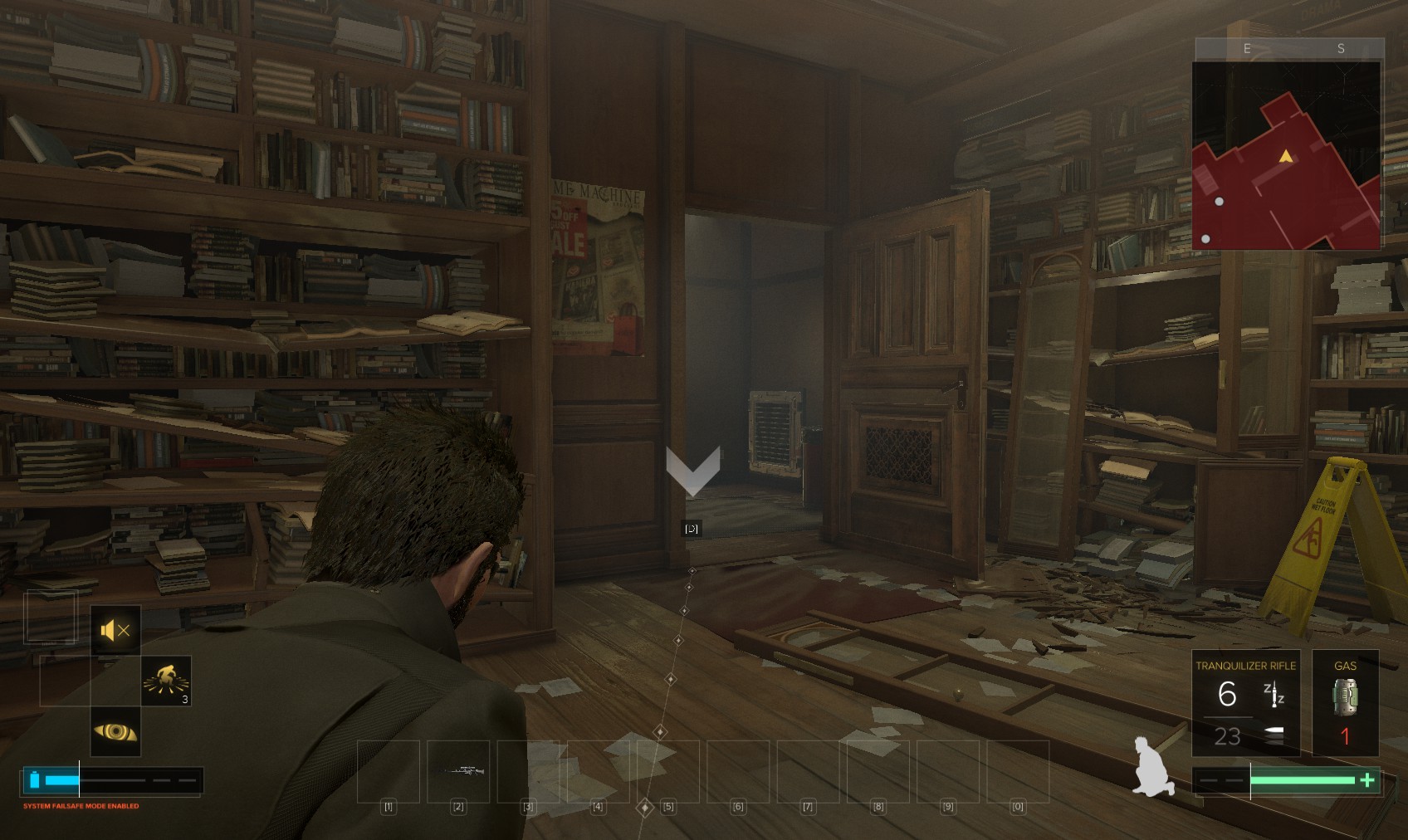 29. Three thugs here. The one on the right is the easiest if you wham him while hiding behind the nearest bookcase on the right. The far gunman is next, followed by the chap at the top of the stairs. Beneath a broken bannister beyond the bookcases is a box on top of a shelf (the Biography section) containing hacking tools and
