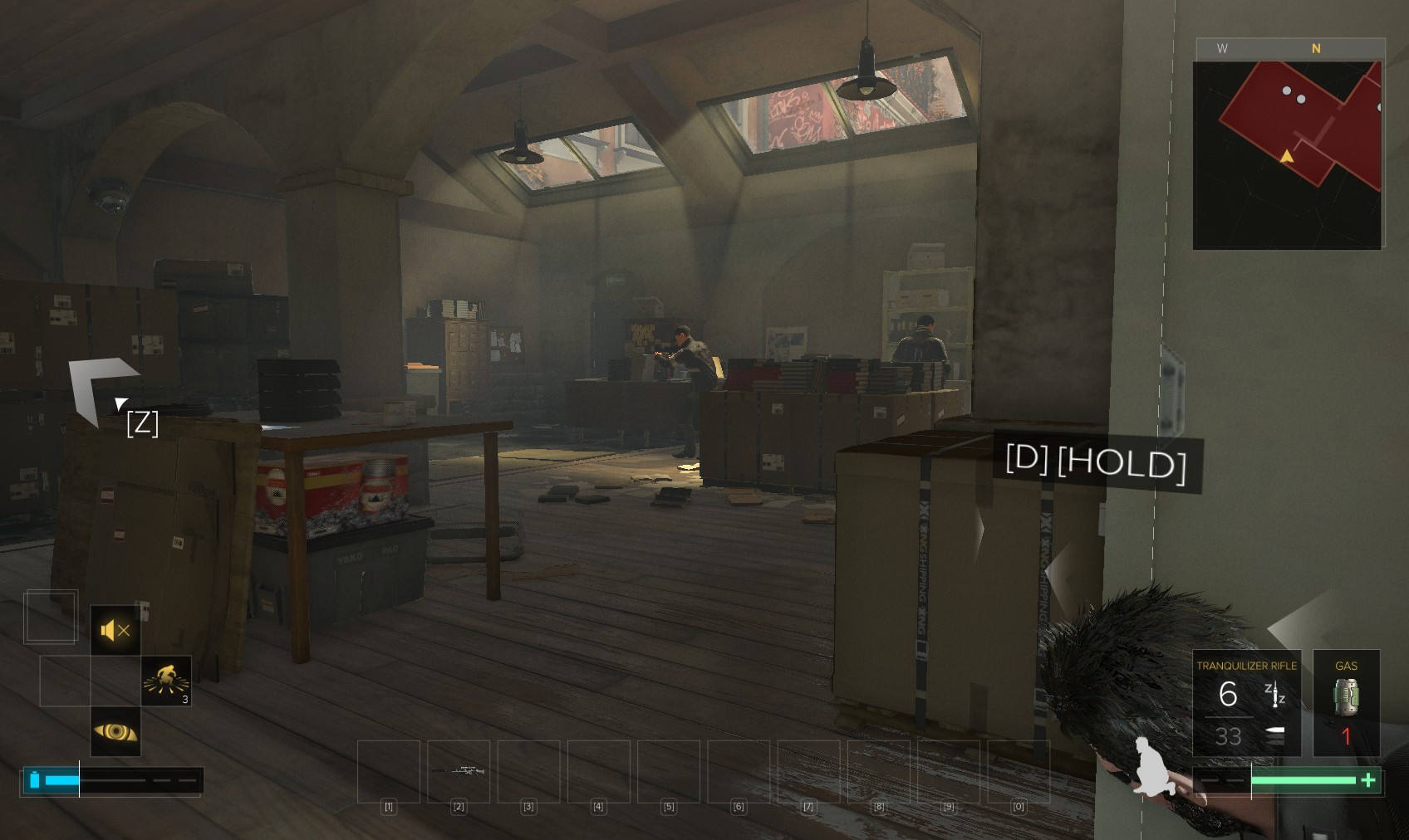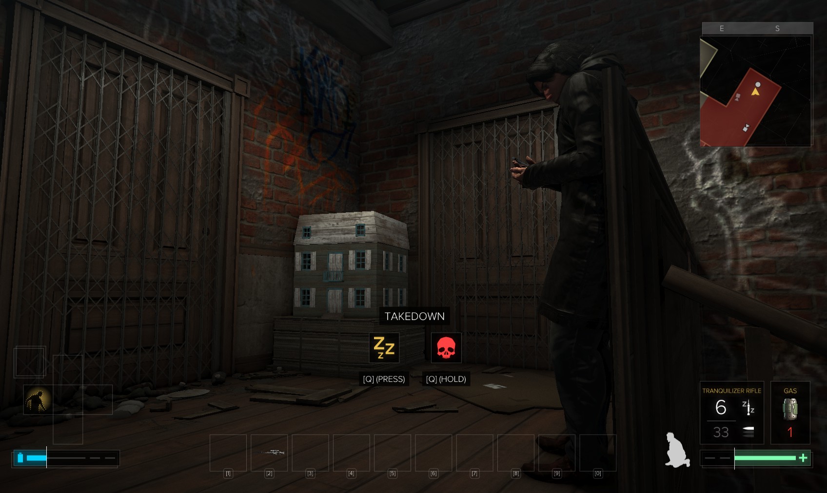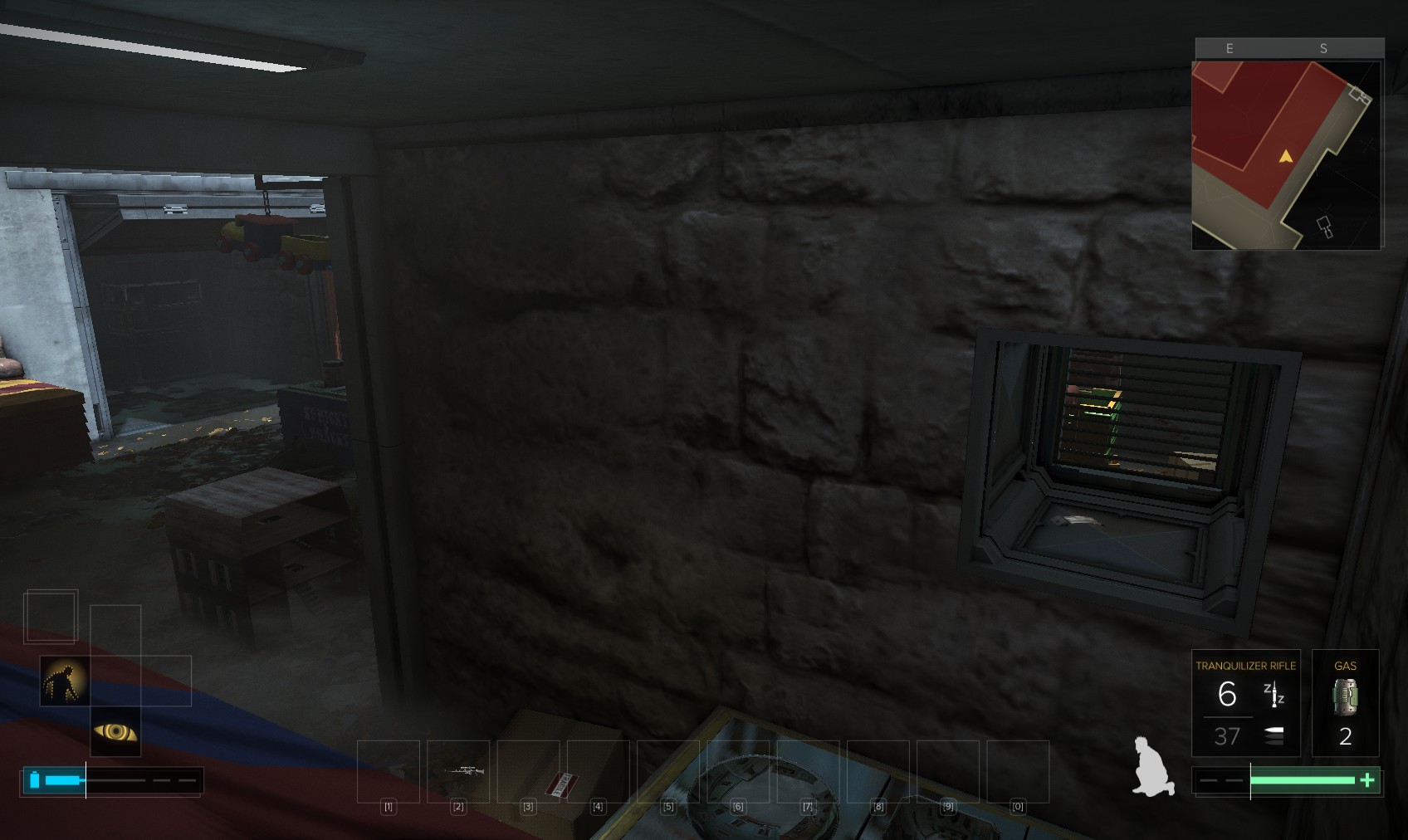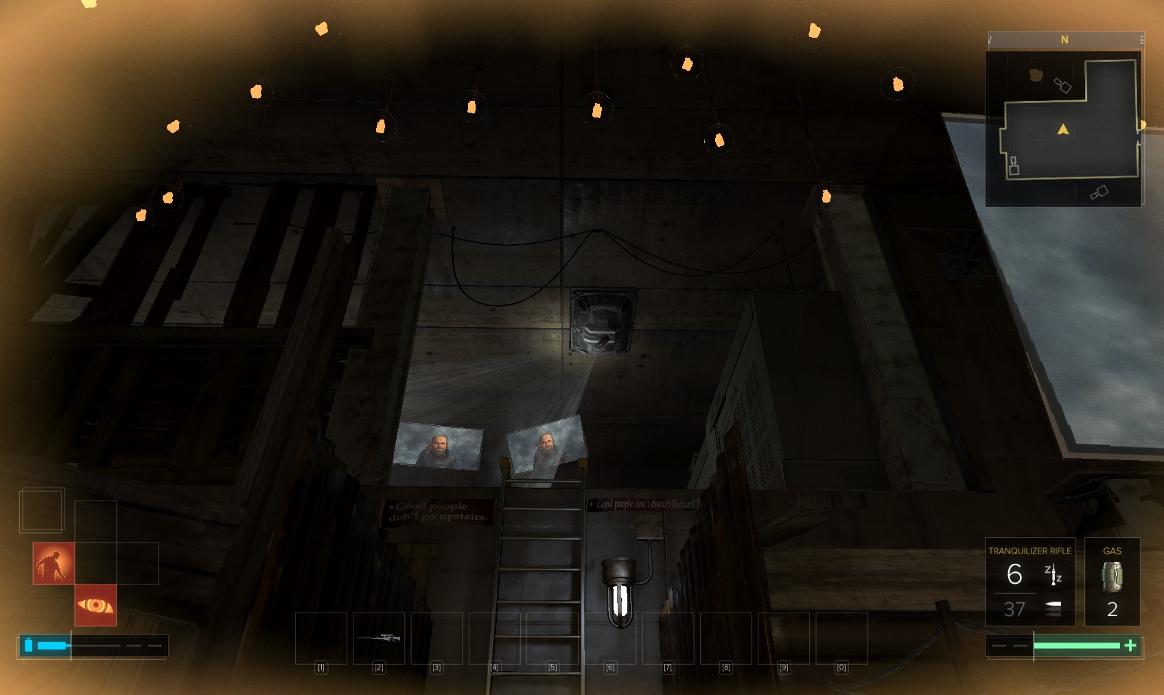 72. Take out the thug at the top of the stairs. You could also have attracted his attention downstairs by chucking stuff around.