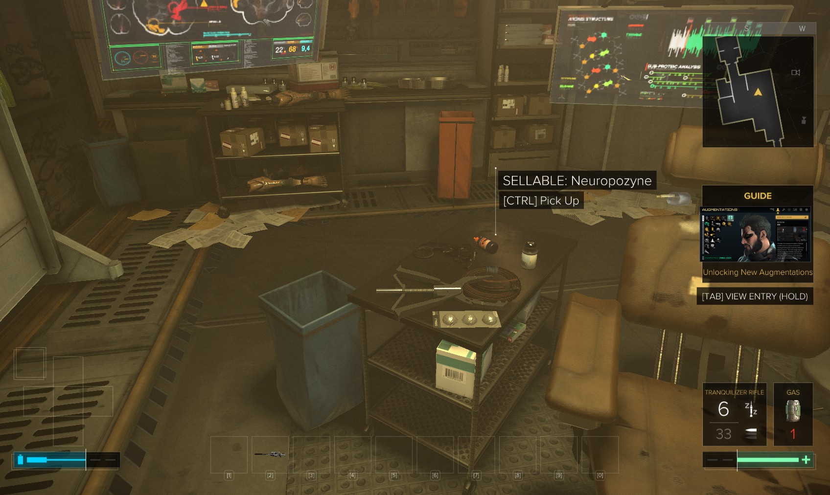 42. More Neuropozyne here. Hunt around for a biocell, hacking software, more sellables, and an unlocked PC with some pretty gruesome background. An