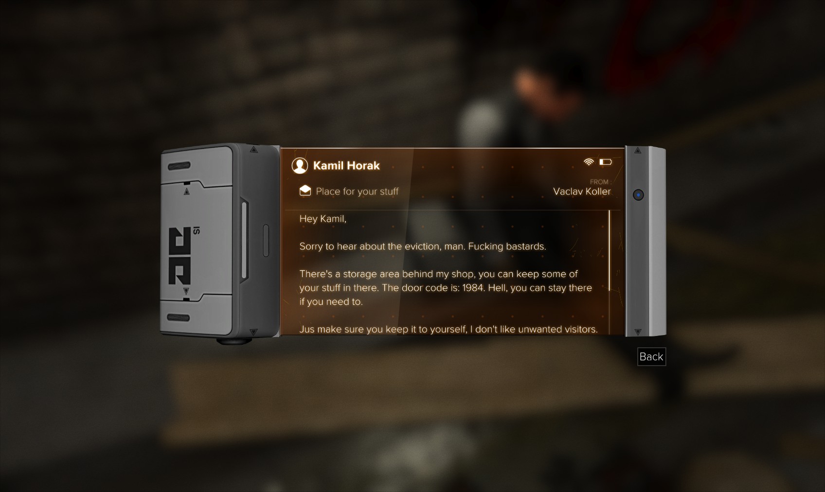 83. He’s being hassled inside, so take out his assailant (from behind is easy enough) and talk to Edward to complete that section of the mission. Milena informs you that you’ll need to validate the permits in another part of town, so that will have to wait for now. She gives you the code 6788 to the server room in the registration office. Edward’s unlocked PC indicates who the thug was, but you’ve already
