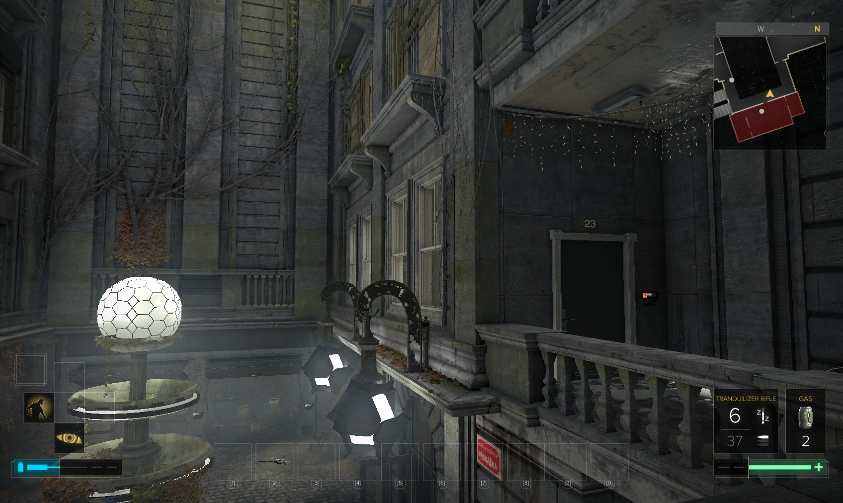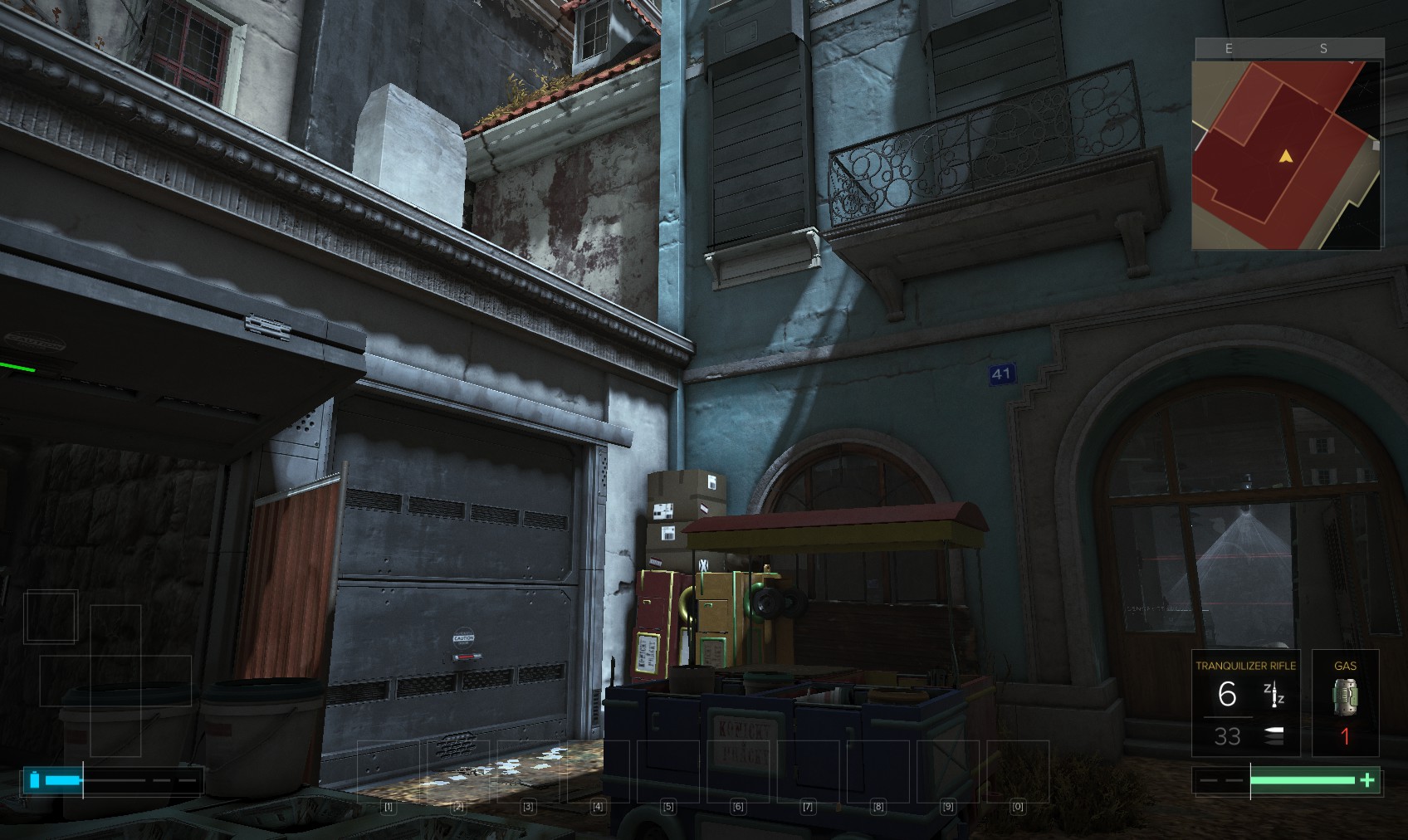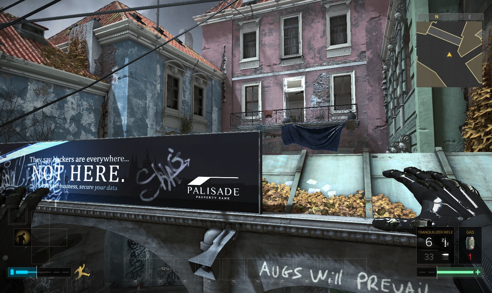 61. You can climb up the scaffolding and onto the balcony here, and then sneak over the wall on the left silently if you’re careful. It’s easier if you have the cybernetic leg augmentation. It’s good to have anyway.