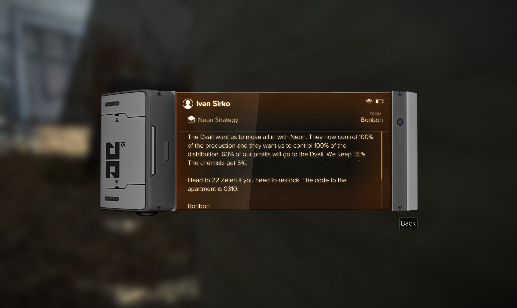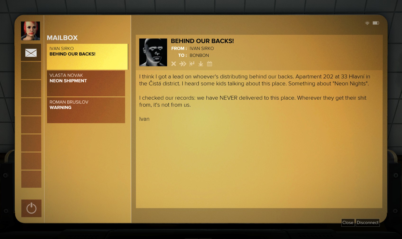 62. Heading into the apartment as you go nets you a 200 bonus, some credits, hacking software and other goodies, and an unlocked PC with an email from "Ales PK" revealing Franki Valek as the owner. An
