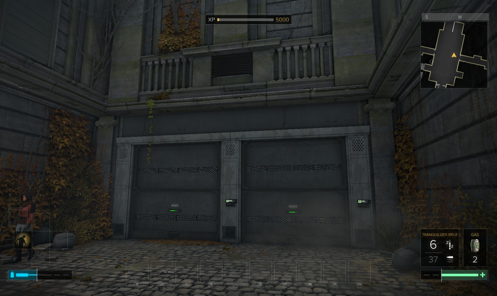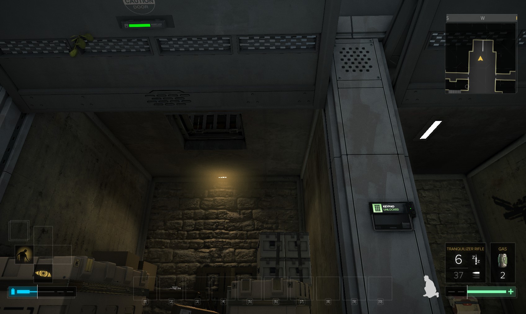 9002 for 100XP (still less than hacking bonuses). You can disable the electrics with the breaker visible at the far end. Unless you’ve upgraded your dermal armour, you won’t get to the breaker before you’re dead without something to stand on. Behind you is a large crate which you can place if you’ve upgraded your arm augmentation to lift heavy objects. Alternatively, head outside again and collect the smaller crate by the scafffolding (shown bottom-left