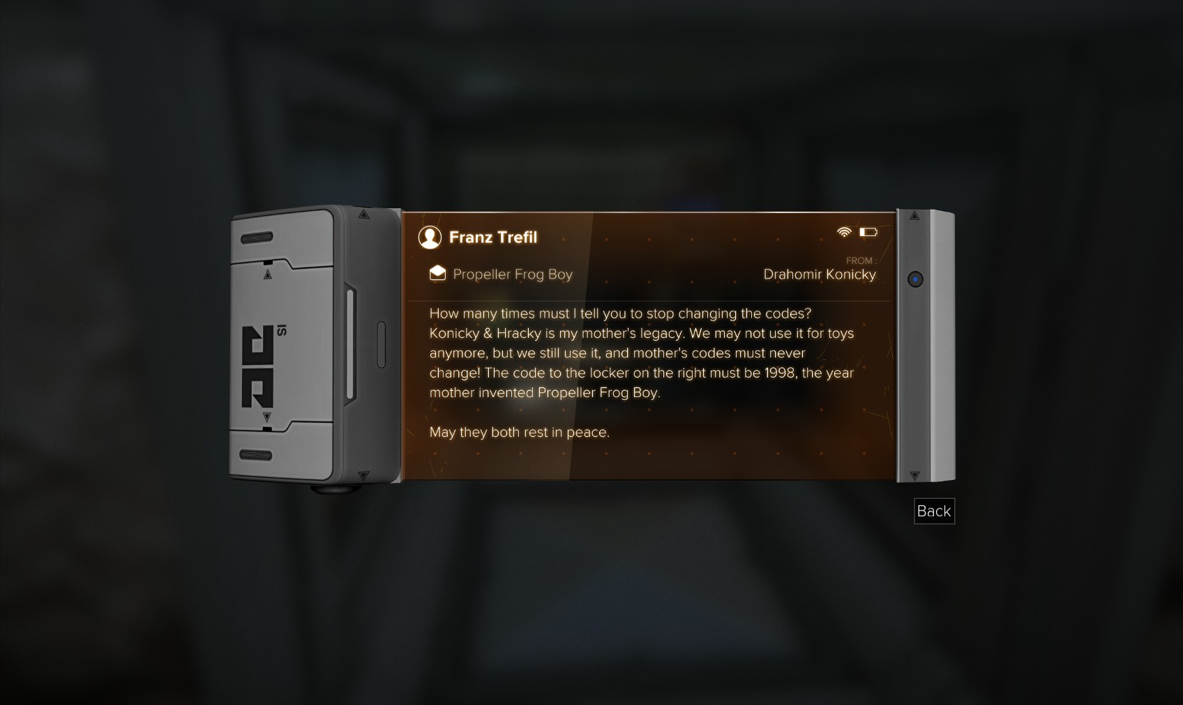 Inside there are lots of gooding including breach software, a shotgun and a level 3 PC (revealing Josef Severn as the occupant), which you don’t have the skills yet to break. An EBook about the Machine God provides some background to what appears to be some strange religious rite going on in the bedroom.