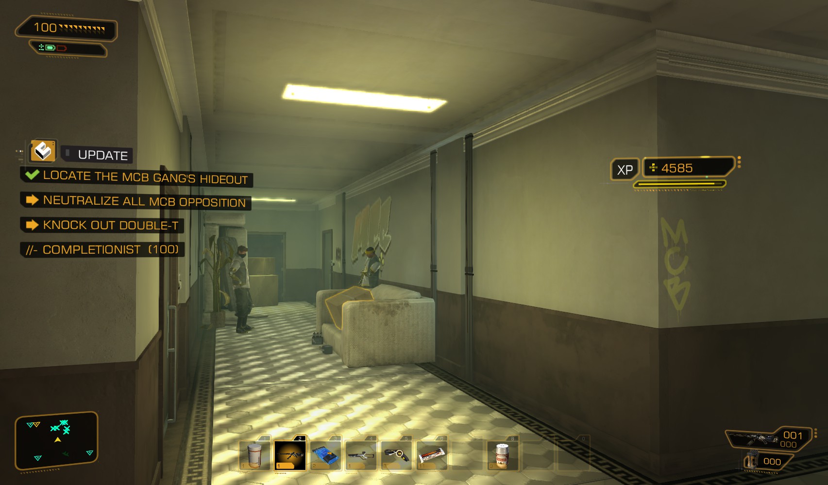 60. Back to the vent and going right again, the last vent brings you here for a 200XP explorer bonus. The level 1 PC (nuke software) reveals this is Jenny Alexander's office. Read the emails for some tips on getting into DRB territory safely. A machine pistol is almost hidden on a nearby bookcase. Nab the automatic unlocking device on the desk - these are sometimes handy when you can’t safely hack something.