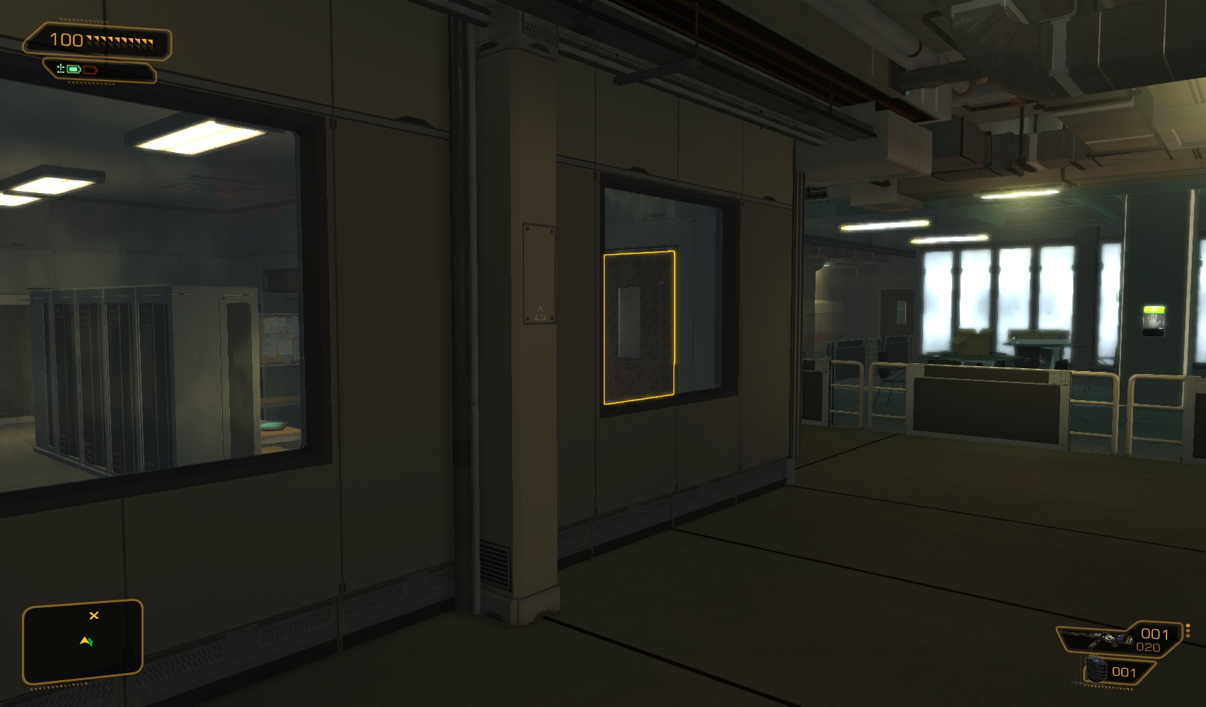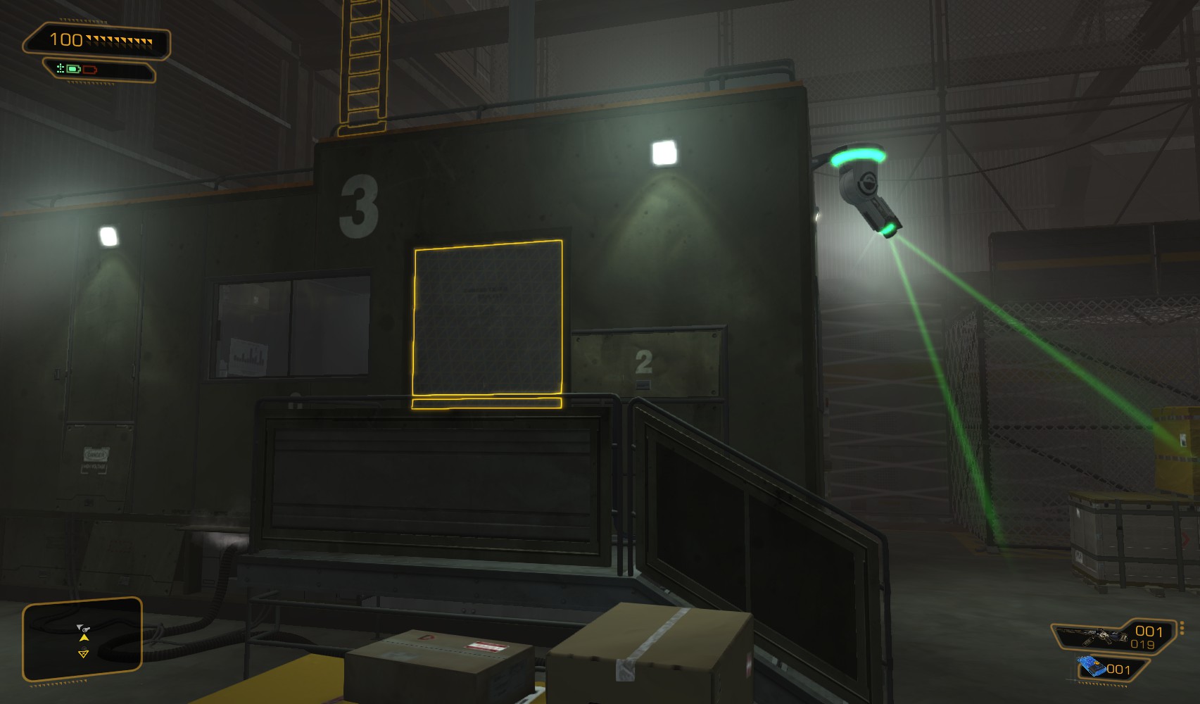 86. The laser array is easily bypassed by just using the other door. It’s a level 2 hack (password again: 7984) for 75c and 75XP. A vent just beyond it is worth entering for a 200XP explorer bonus but just leads back to another vent behind a heavy crate to the left of this shot.