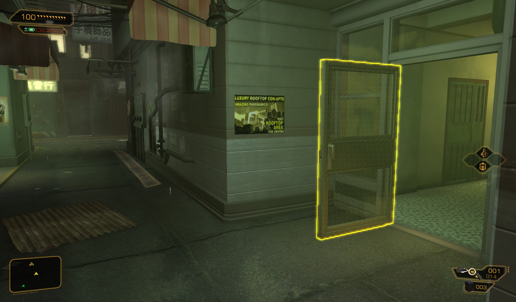 71. As you leave, unless you had your biochip replaced, your augs glitch, along with everyone nearby (except Tong himself, funnily enough). Head out through an open door straight ahead out of Tong’s office.