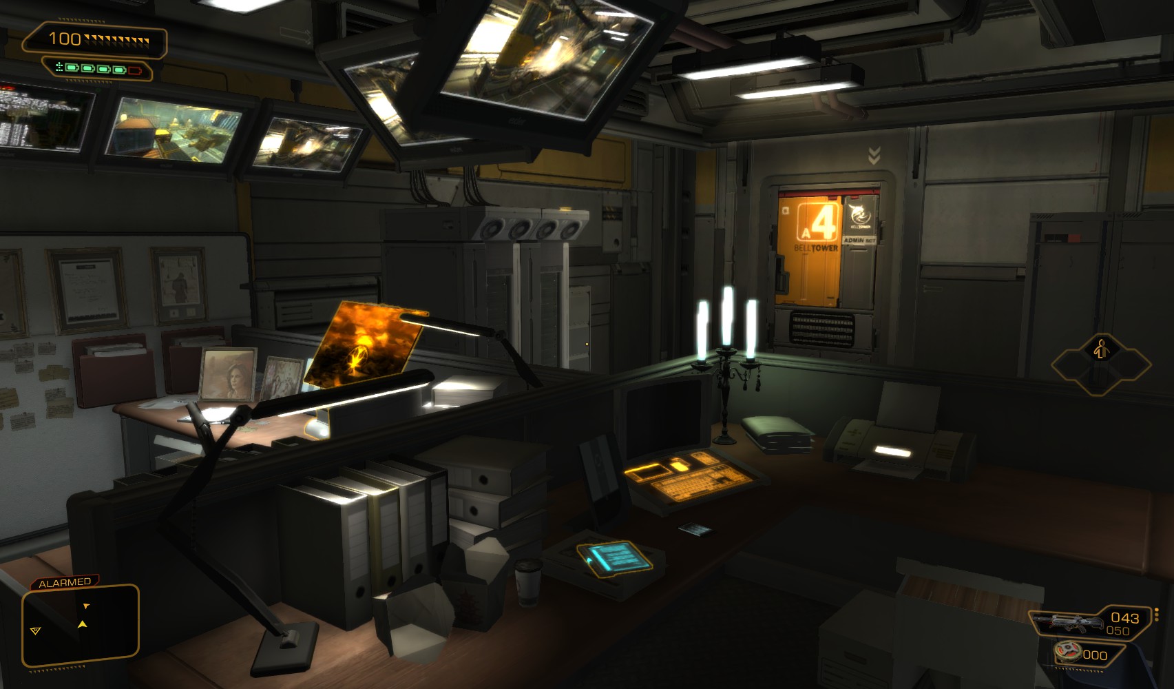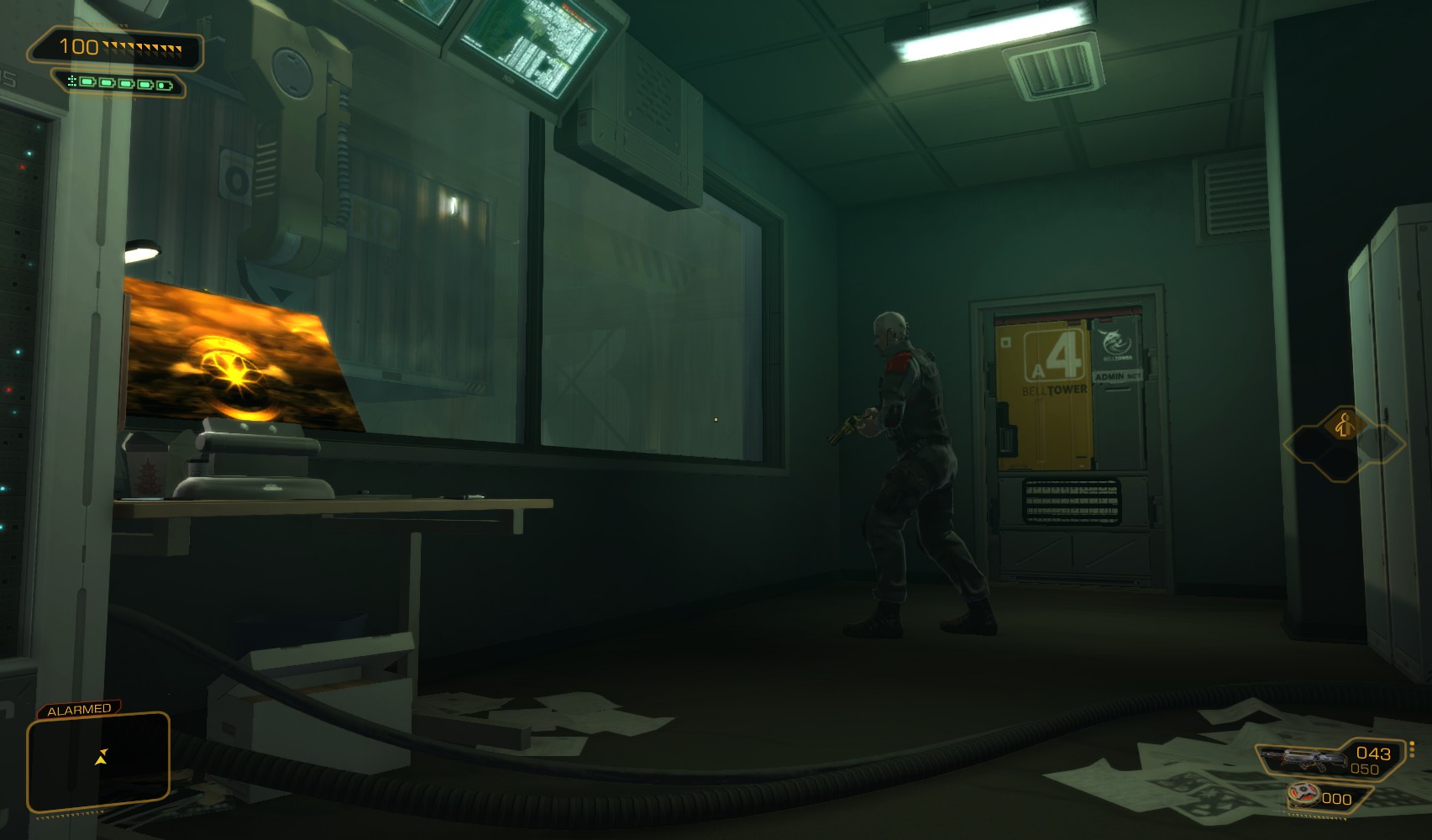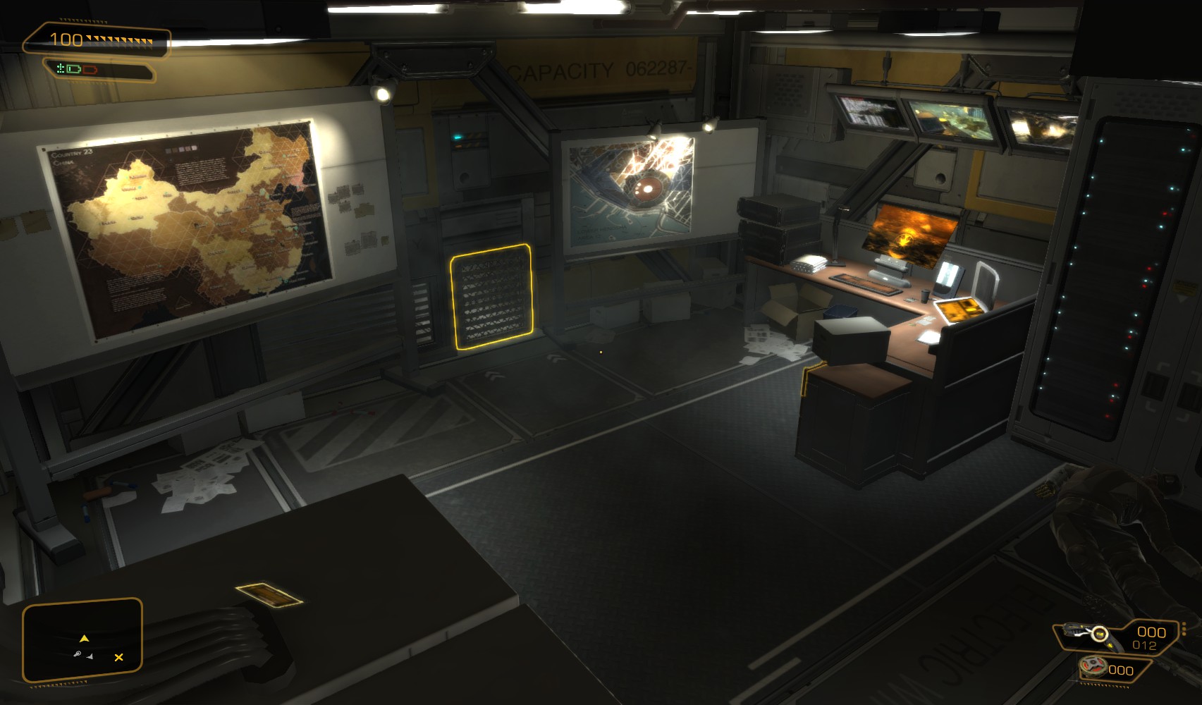 22. Take the first exit upstairs and find yourself in Burke’s office. The level 3 PC gets you 100c and 100XP (password is theogony313). Swipe his spare prosthesis from the desk. A button under the desk opens a secret stash in the wall opposite which has a golden revolver. Also search round for credits and hacking tools before going back into the vent and going left.