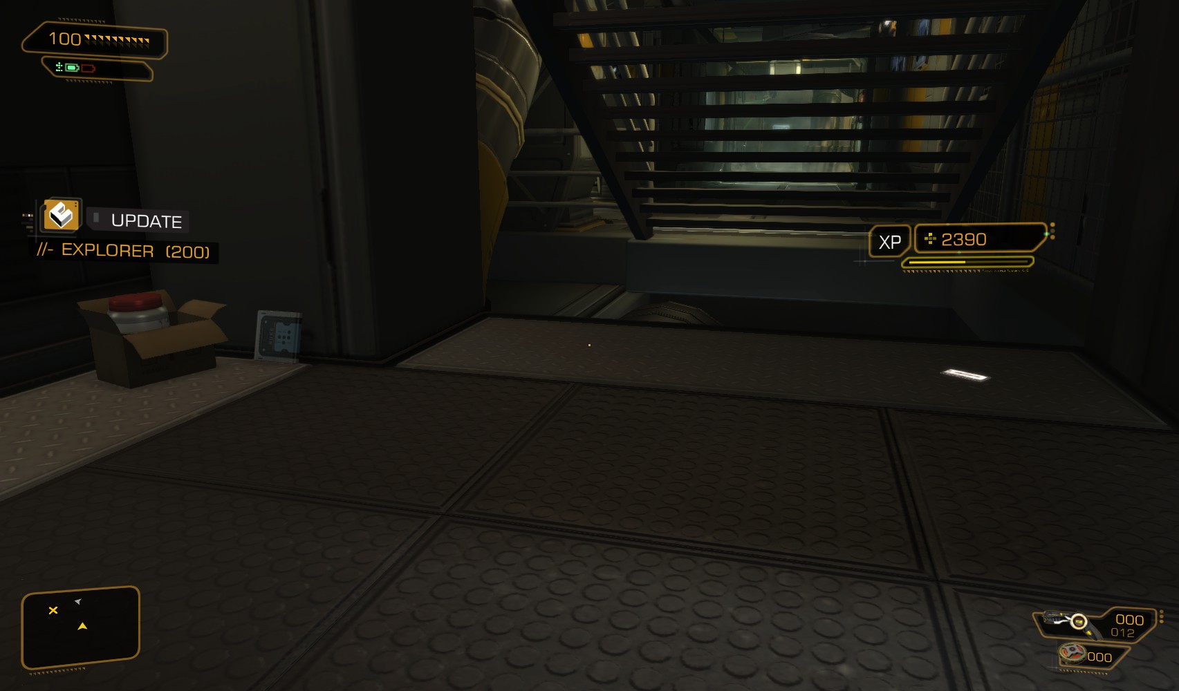 83. In the rear, Quinn’s PC is unlocked. Move some crates next to it to reveal a switch that opens the secret stash and gets you a 100XP traveller bonus. Inside there is a level 5 PC to hack for 200XP and a nuke. Read some more background on our Mr Quinn before heading upstairs. This time use the elevator.
