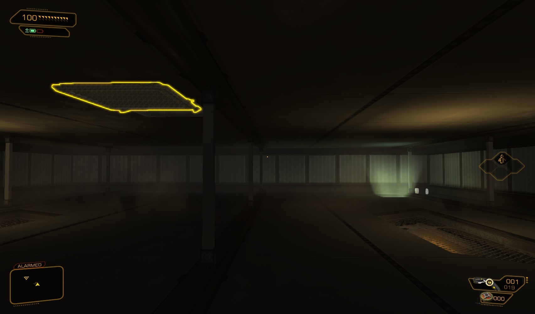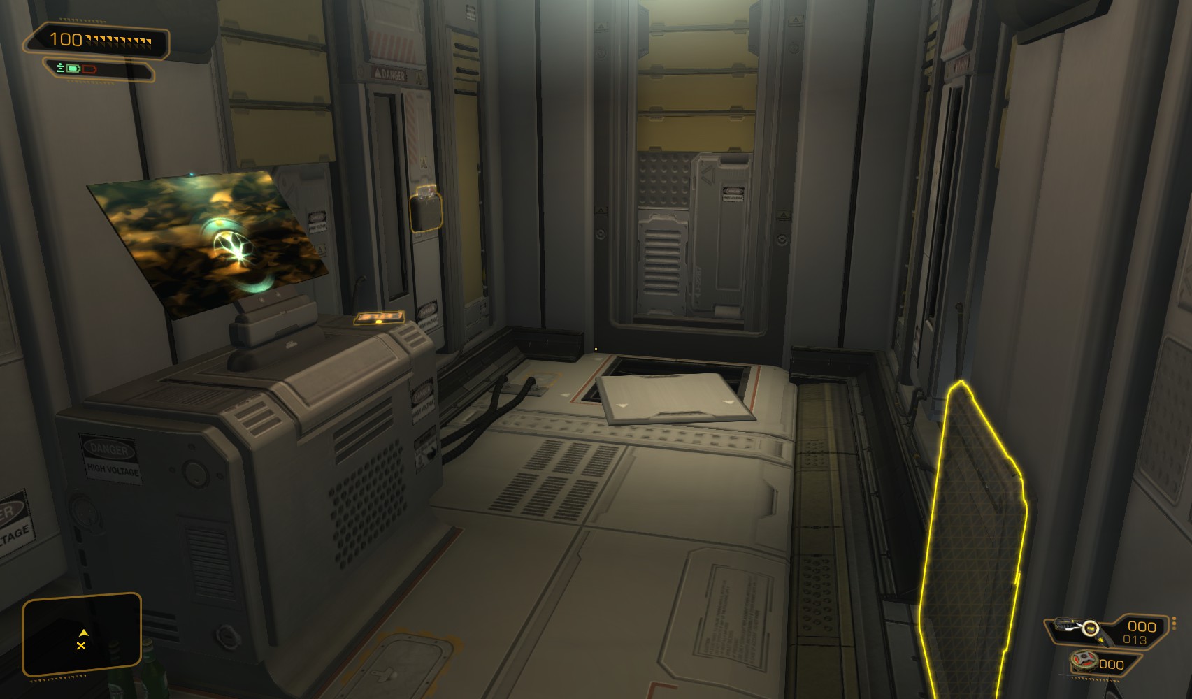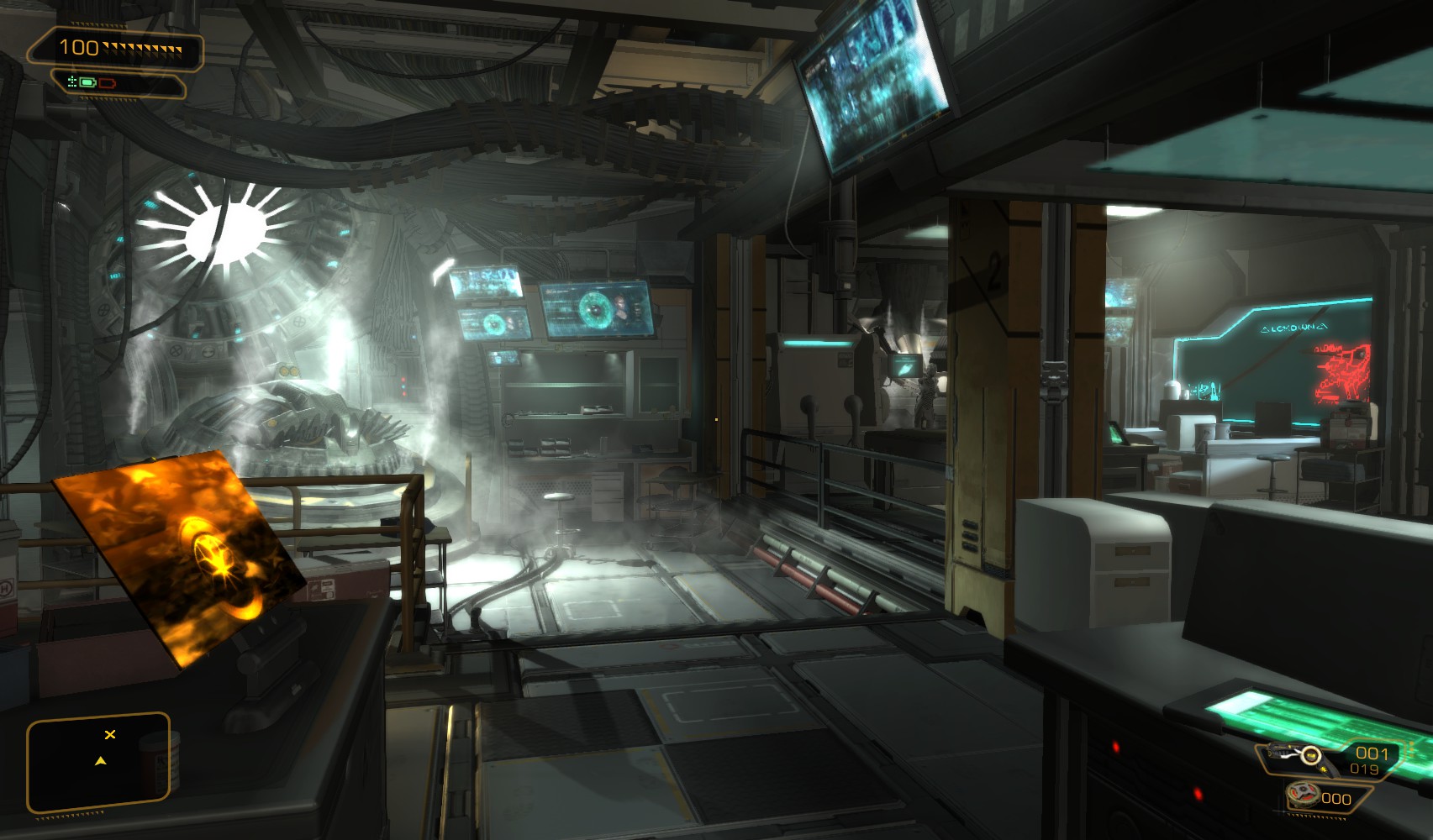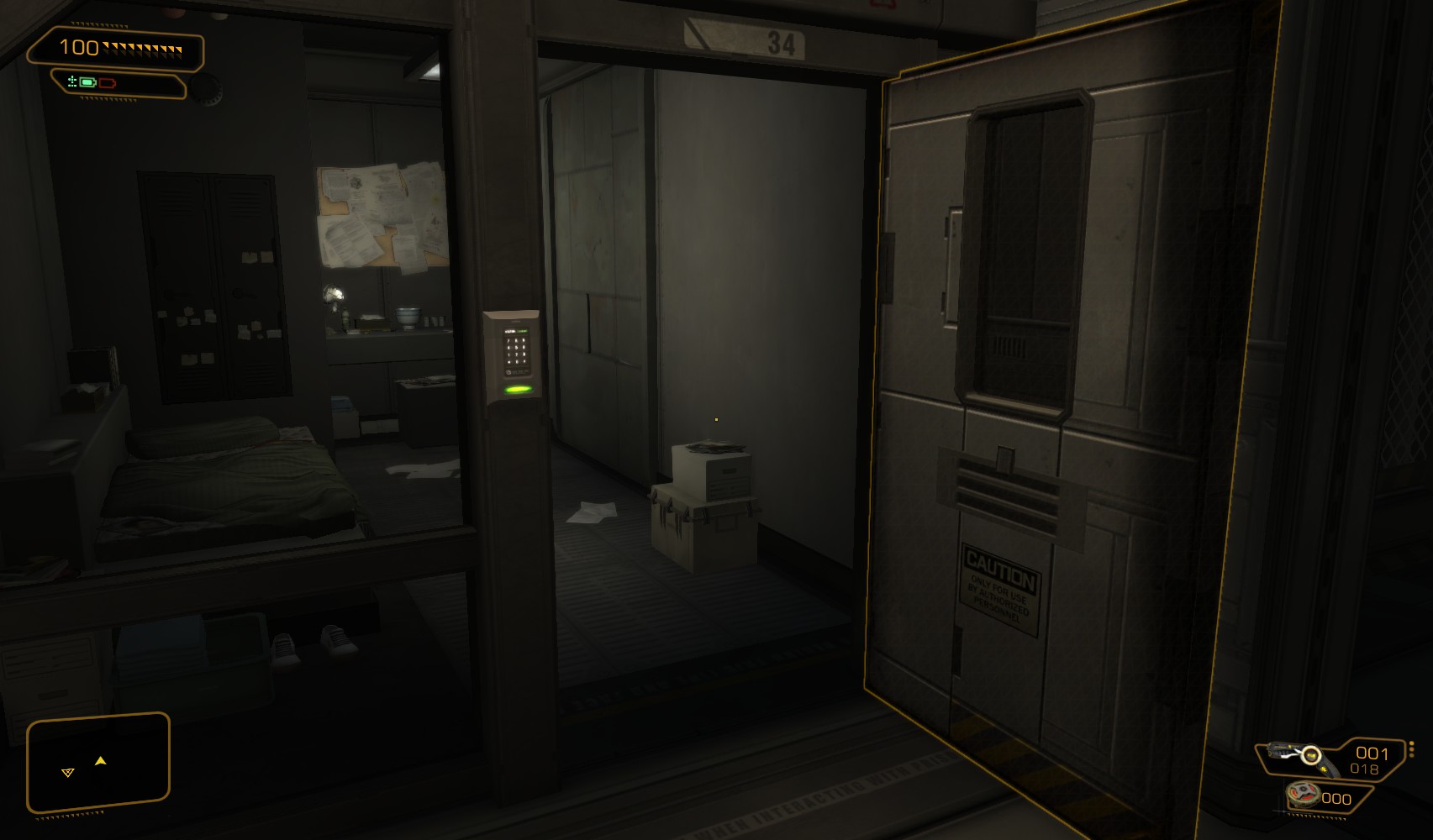 53. Return to the morgue. Climb on the shelves to the left to find Typhoon ammo, before using your newly modified prosthetic eye to fool the retinal scanner.