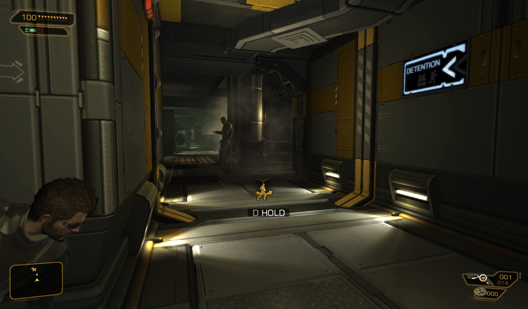 76. Quinn contacts you and suggests you visit his "shop". Careful exiting the scanner, as all the guards are now awakened and on alert. One of them periodically looks down on the door to the detention area.