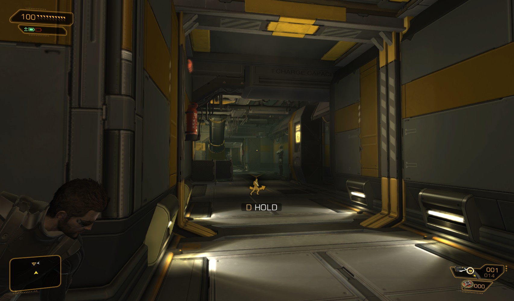 3. Hack a level 3 alarm panel for 50c, then turn left at the end of the corridor and take the elevator.