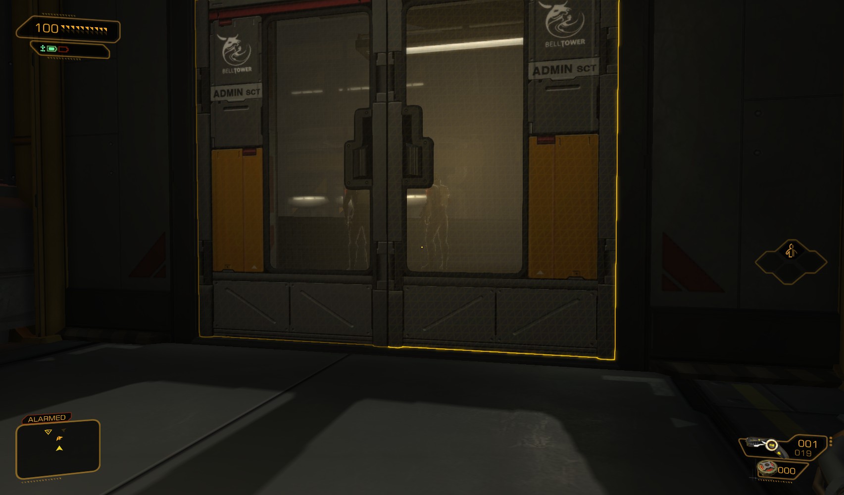 49. One level down, going left out of the cell, another open one with a weakened wall gets me another 200XP explorer bonus. Once on the ground level, I had back through the biometric check. It seems that back in the office area, on the level above at least, some of the guards I knocked out have woken up. Take them out again.