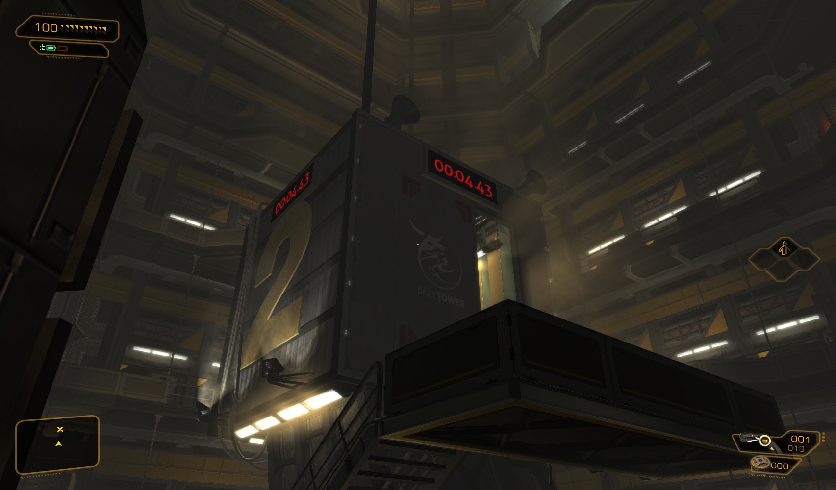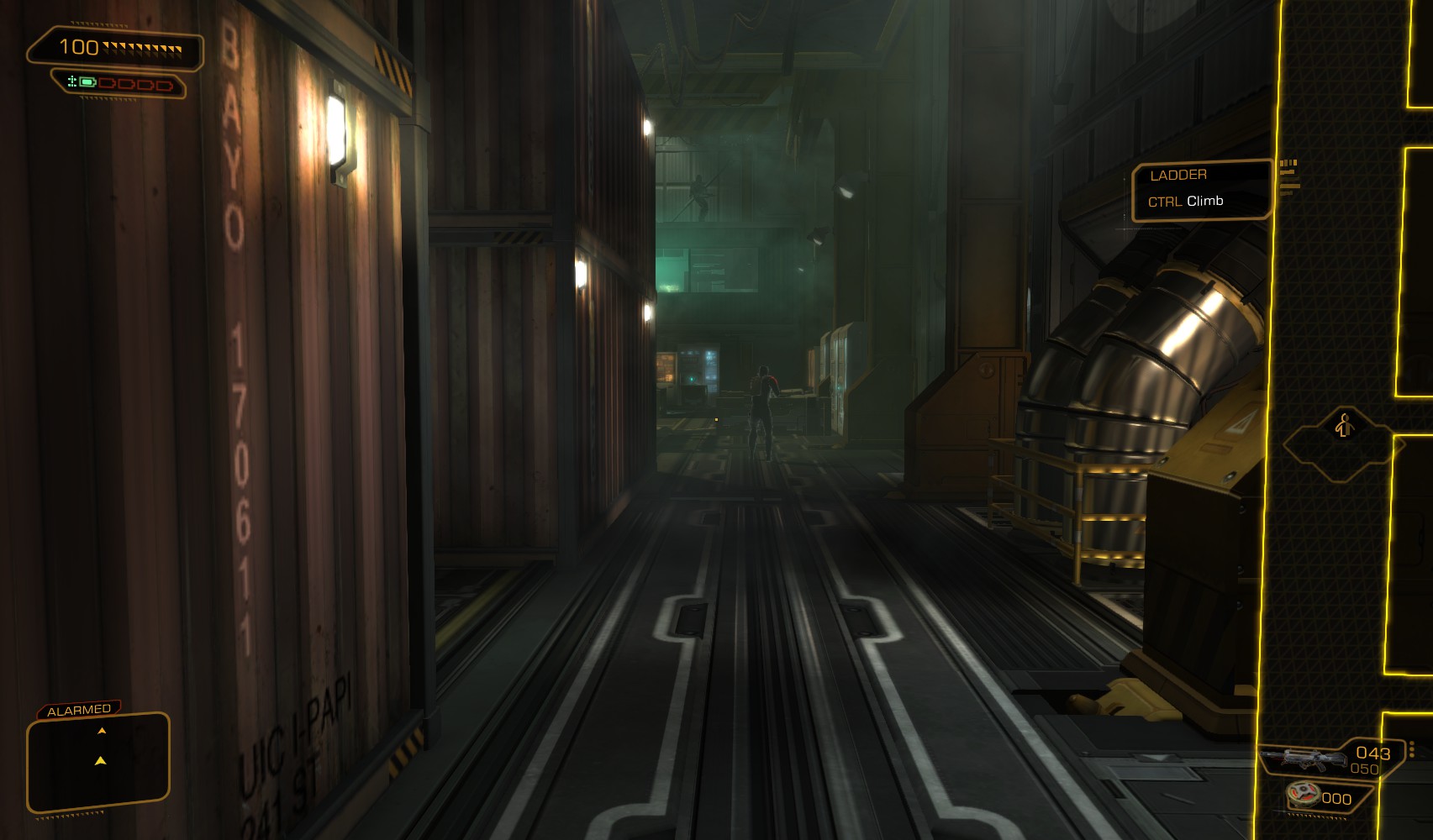 37. Your objective is the security port in the middle. Hack a nearby level 3 alarm panel for 100c when you’re done, and go back down the stairs.